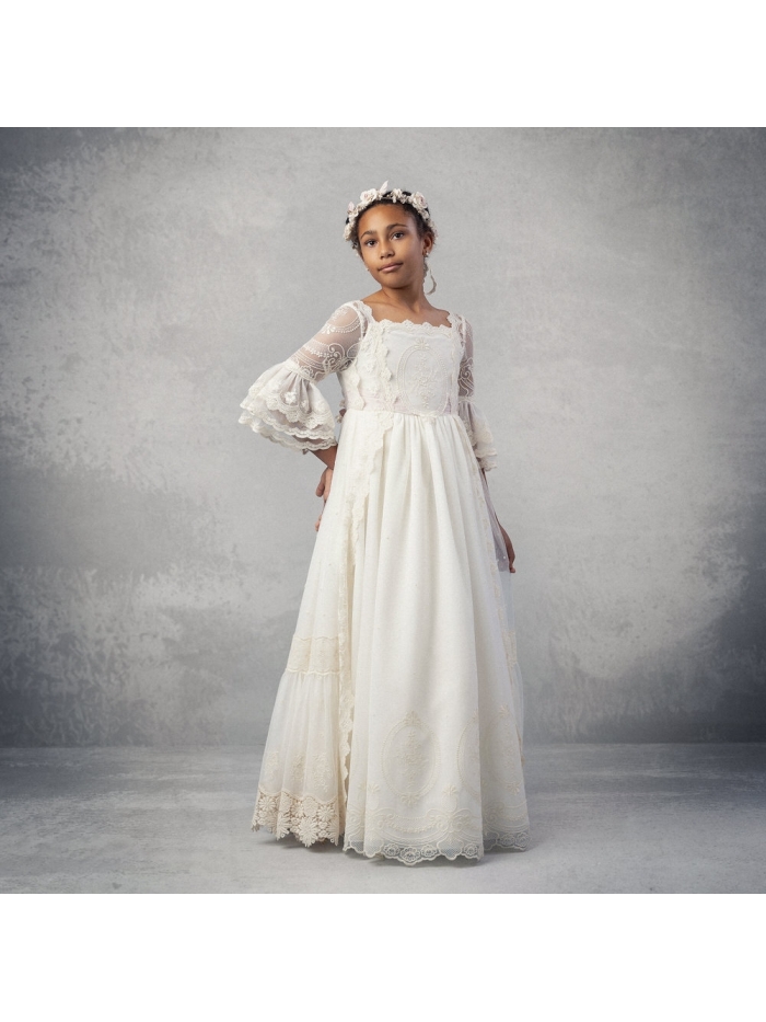 El vestido lleva incluido el aplique de flores del cinturón. (Corona y Complementos van aparte).