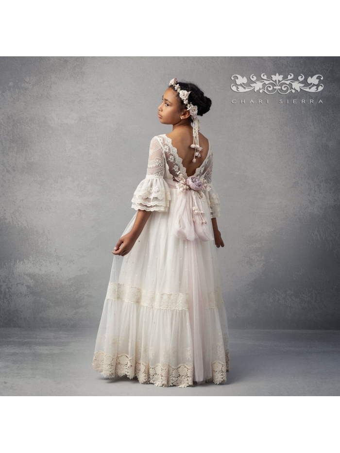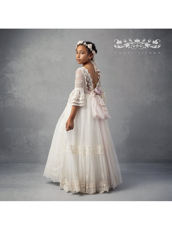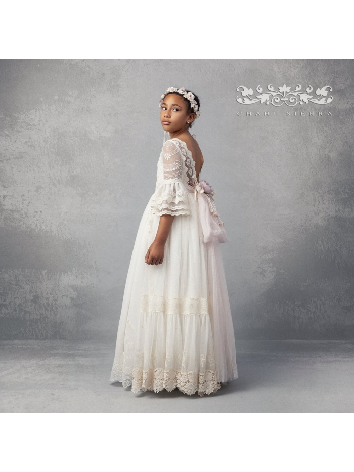 Vestido en tul bordado con falda abierta que aporta movimiento. Una espalda espectacular en pico adornada con puntilla en los extremos y lazada en rosa empolvado con detalle floral y las mangas al codo con volantes.