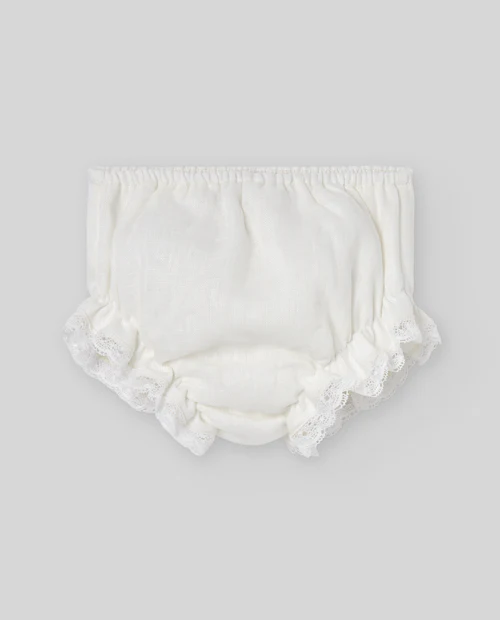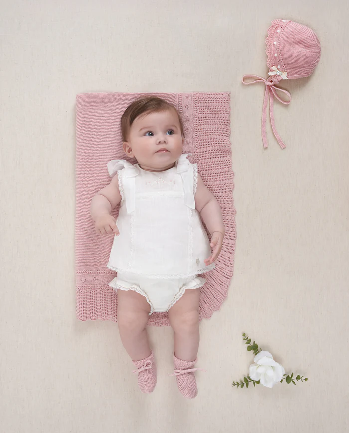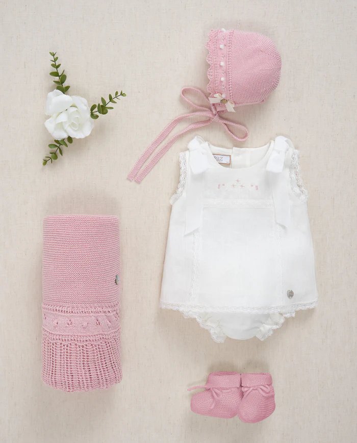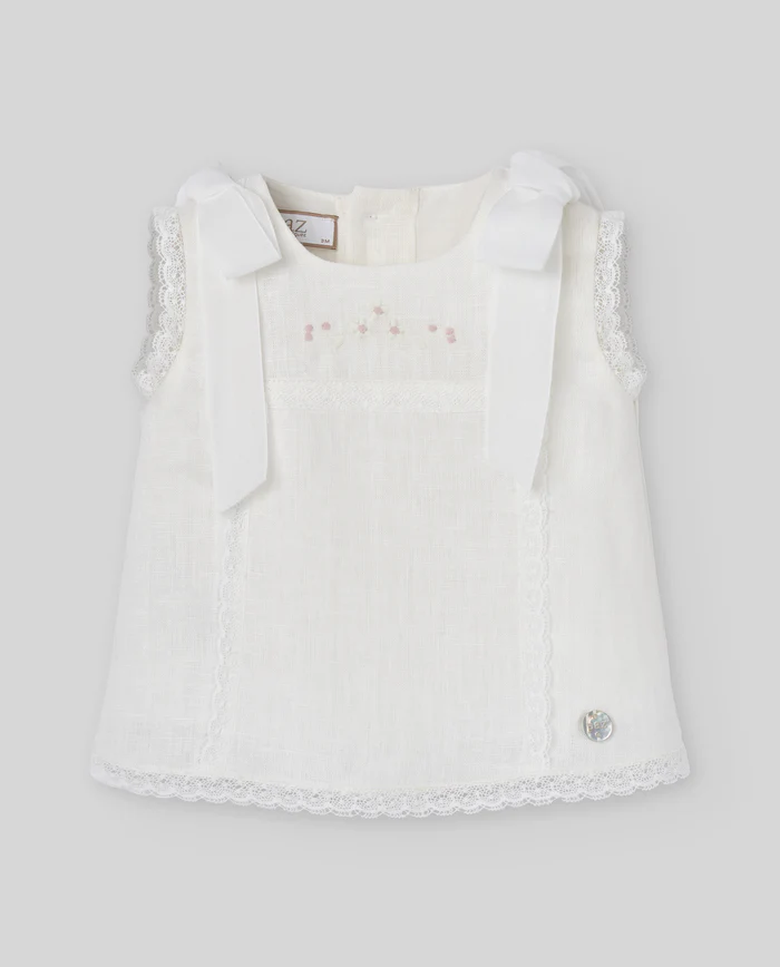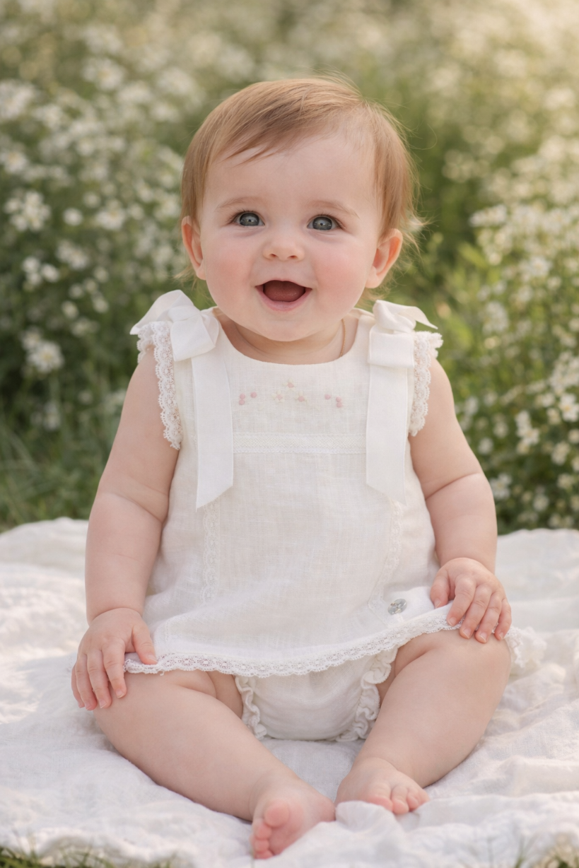 Conjunto para bebé niña de la colección «Alegra» compuesto por vestido corto de lino con detalles bordados y braguita coordinada.