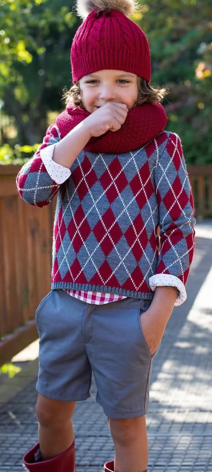 Conjunto de pantalón bermuda gris y camisa cuello mao de cuadros roja con jersey de lana a juego.