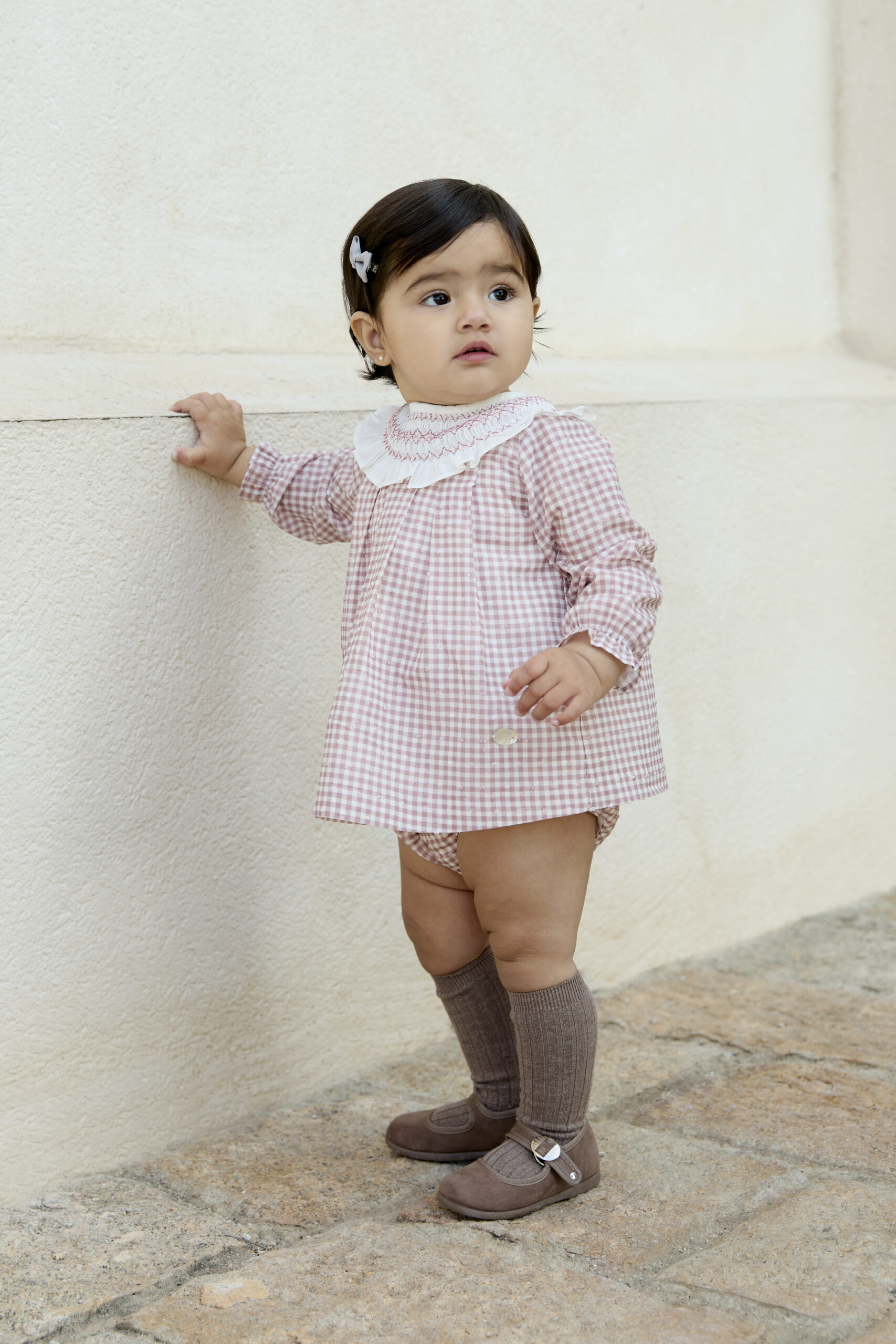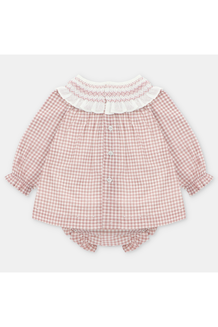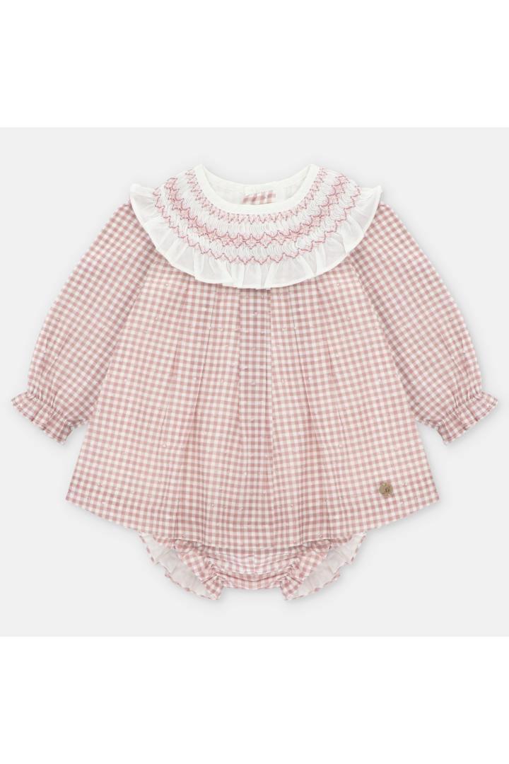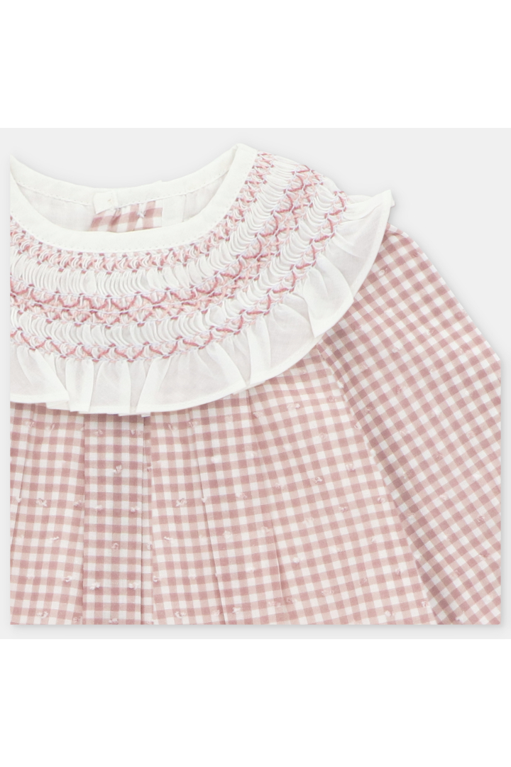 Conjunto de bebé niña formado por vestido y braga de tela microestampada de cuadros con plumeti, detallado por cuello fruncido punto smock con volante, placa ovalada y botonadura de agoya. Realizado en 100% algodón.