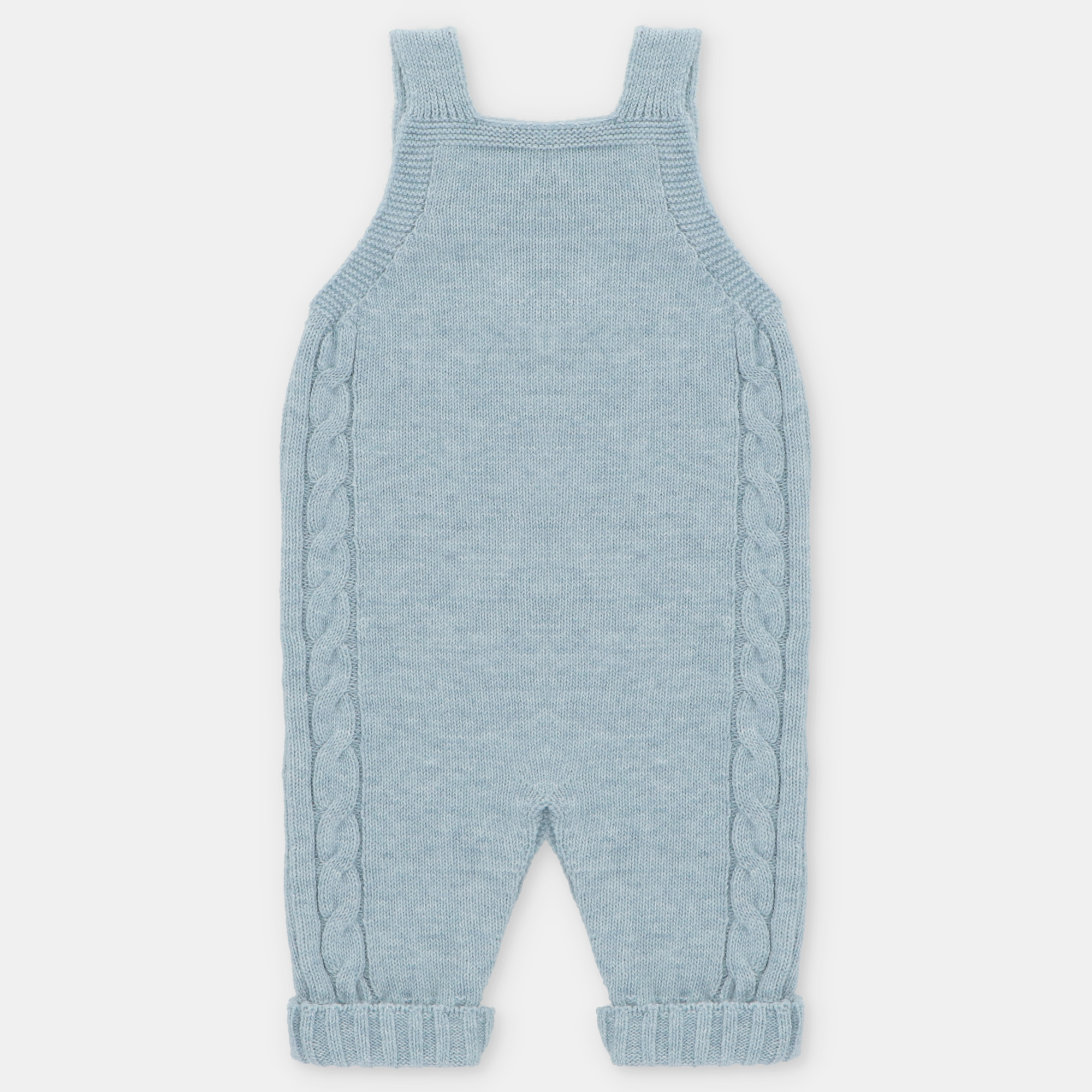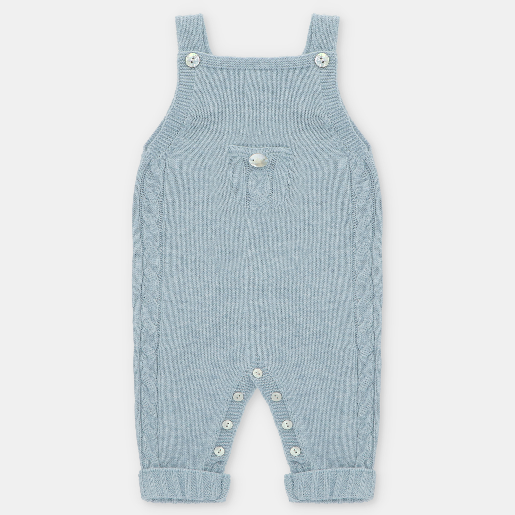 Peto de bebé de punto links con detalles de trenzas, detallado con botonadura de agoya, bolsillo delantero y placa ovalada, en celeste grisáceo.