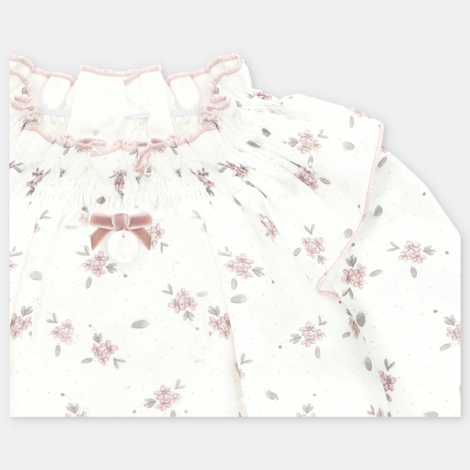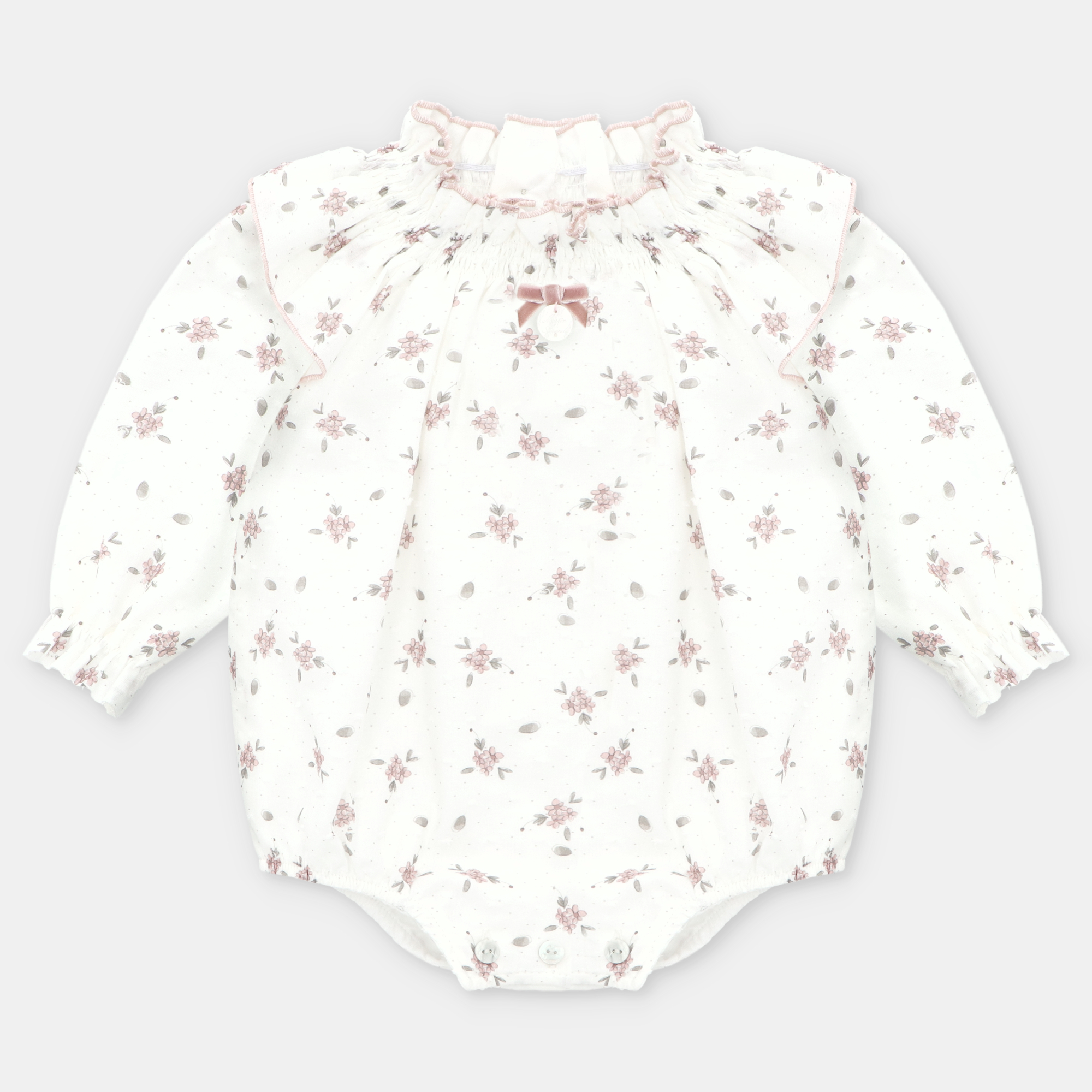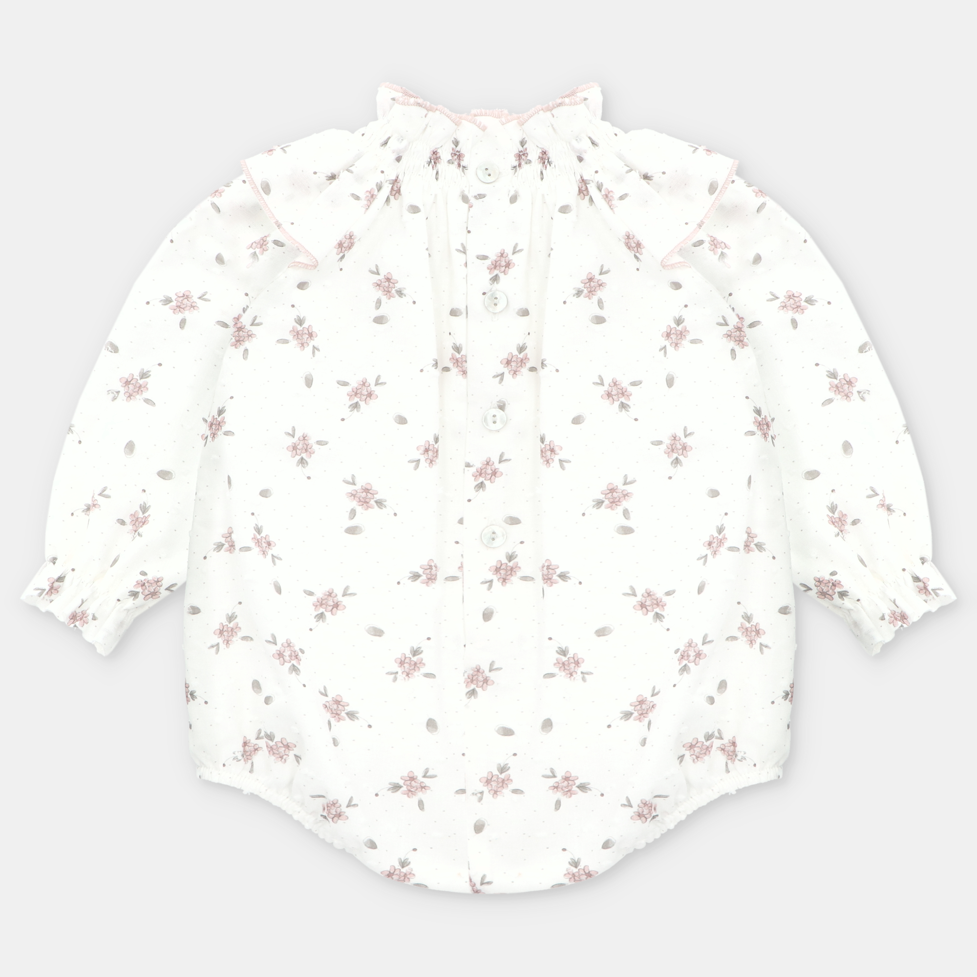 Ranita de tela estampada de flores con volantito en el cuello.