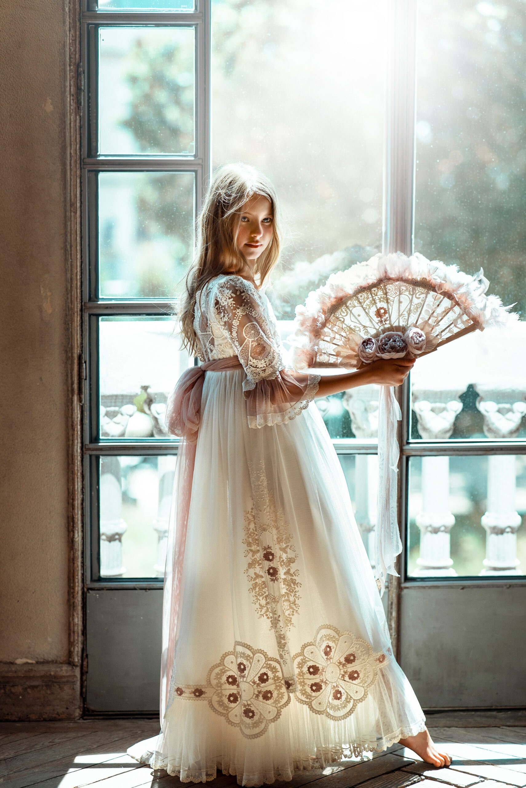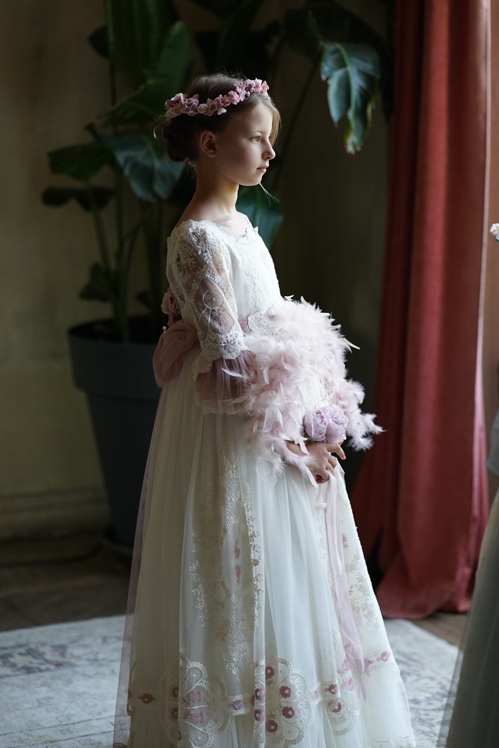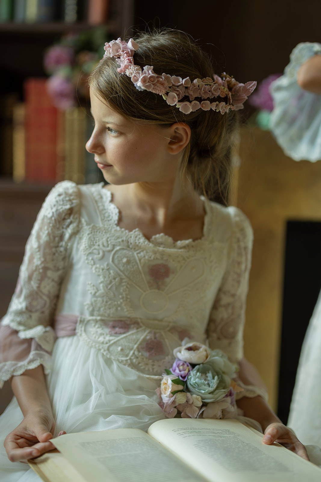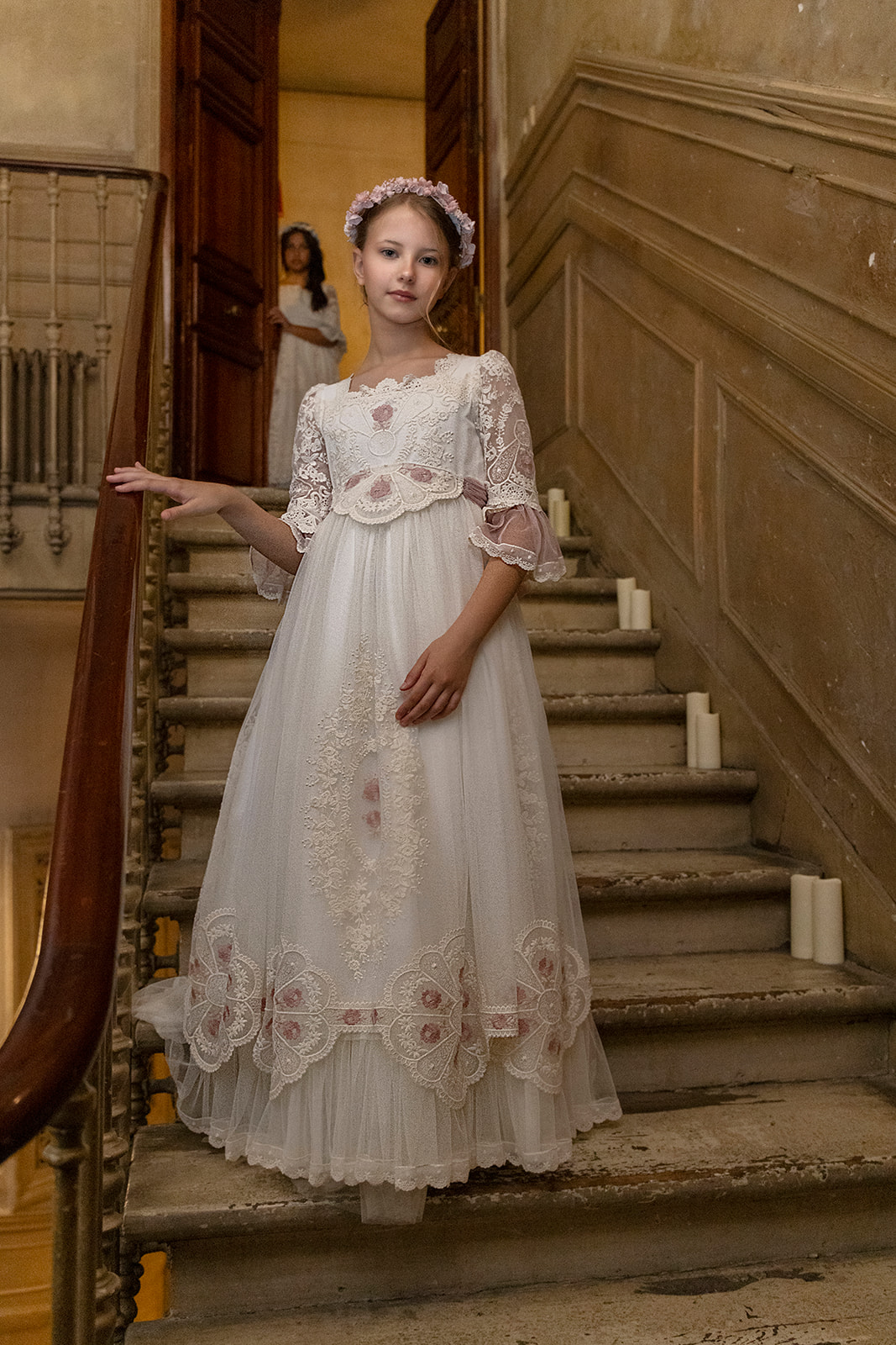 Vestido de Comunión Tul Beige con Medallones bordados en Rosa Empolvado.