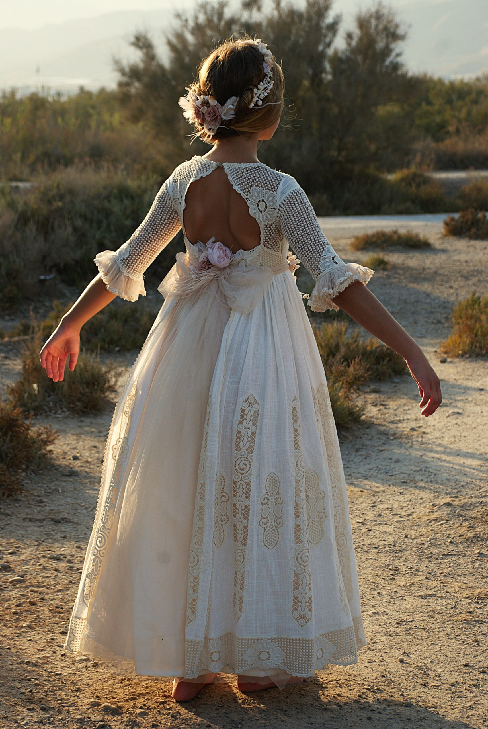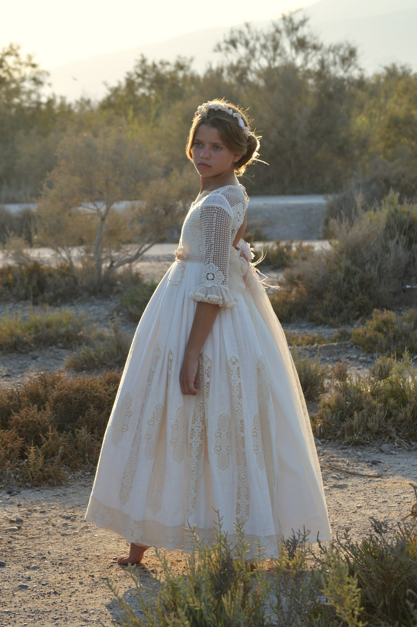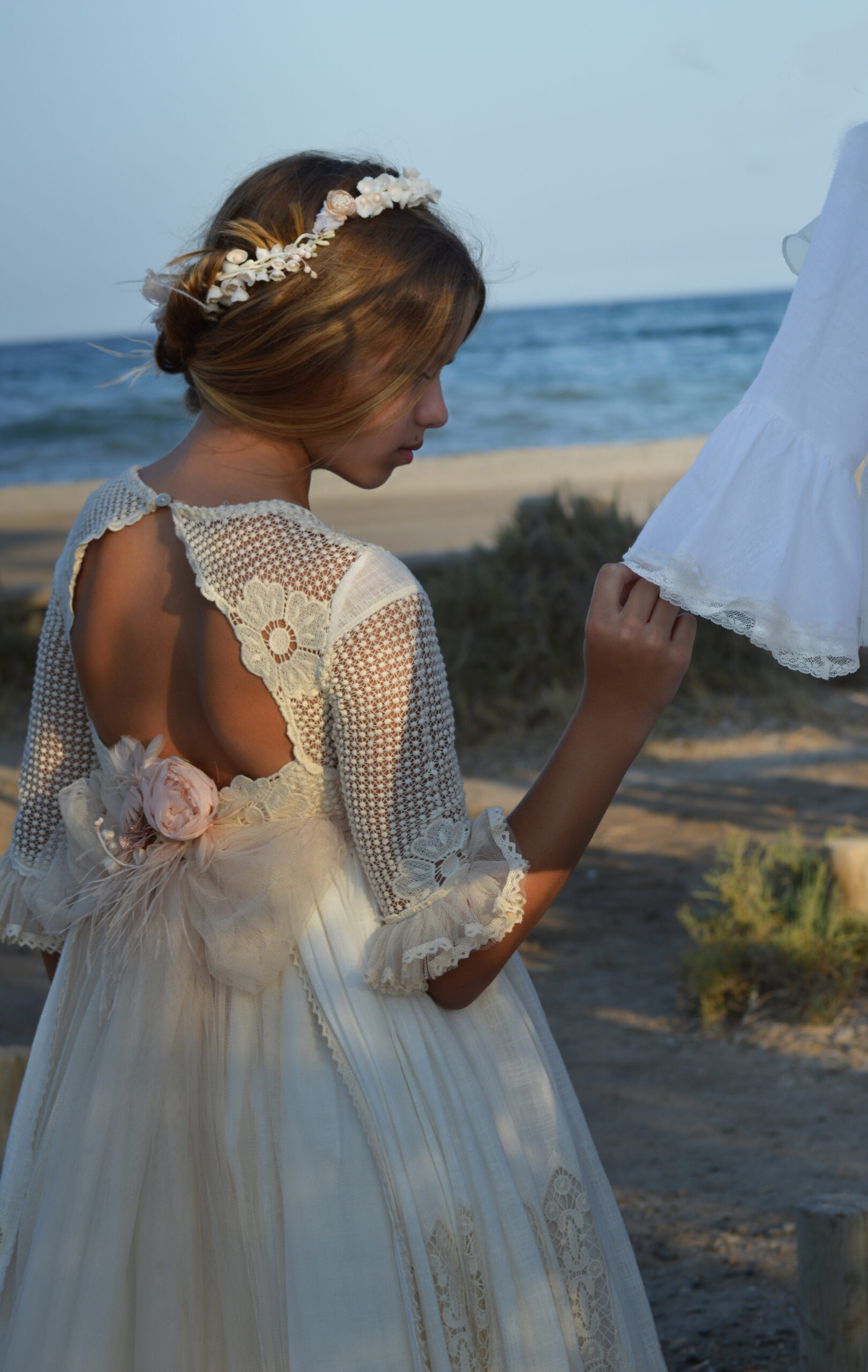 Vestido de Comunión Tul Beige con Espalda Guipur y tela Bordada.