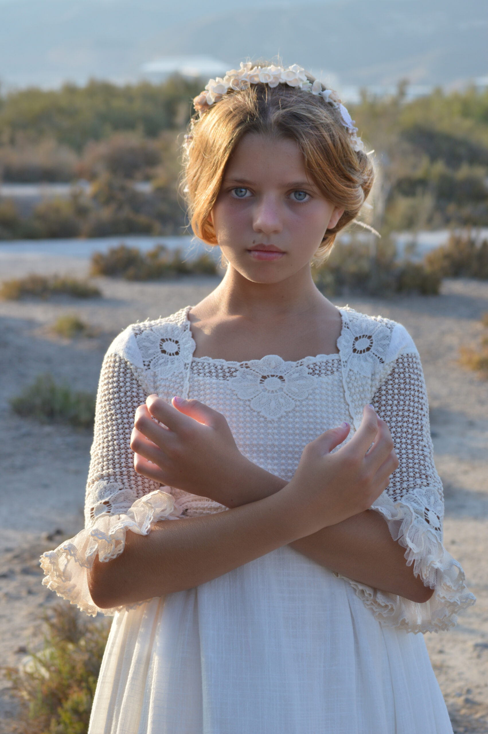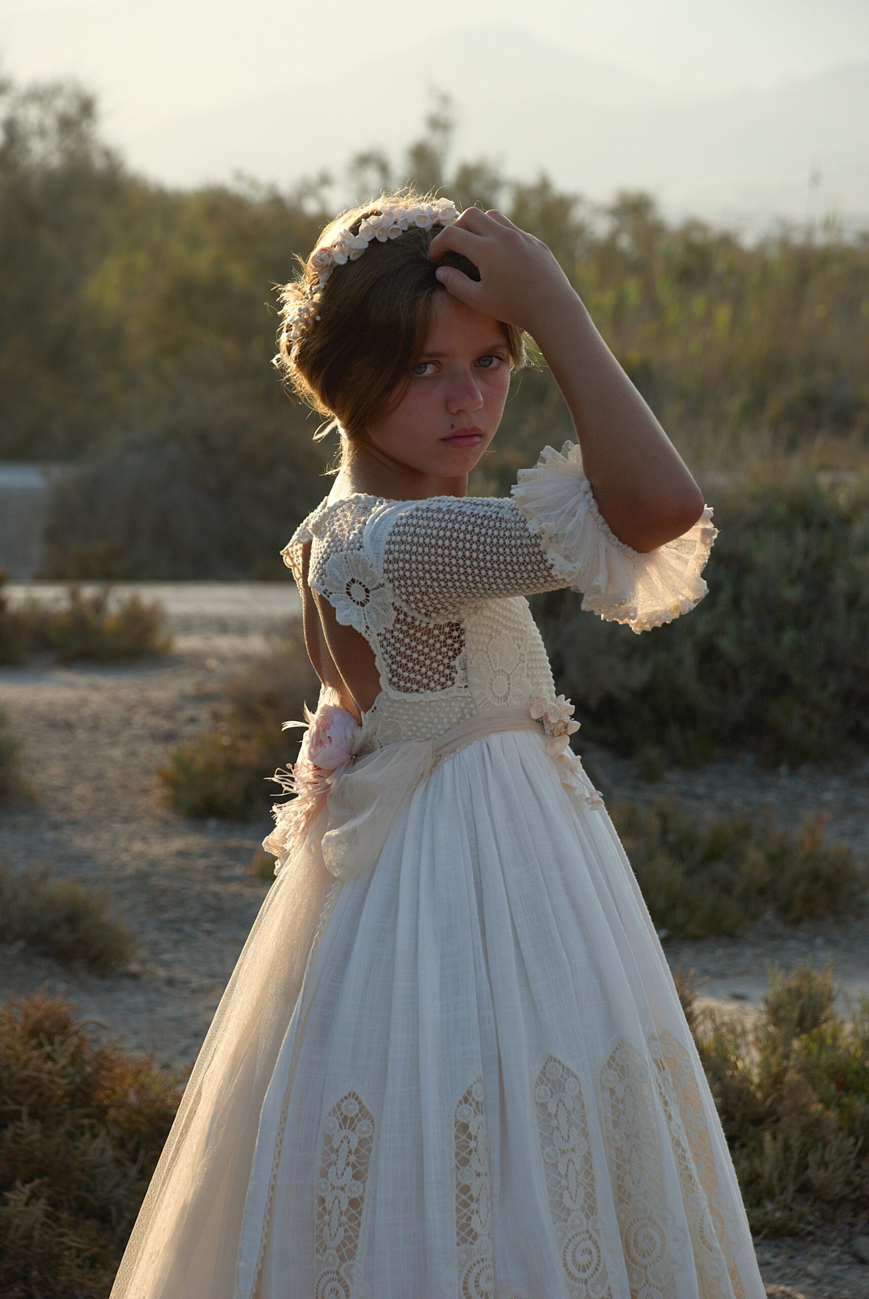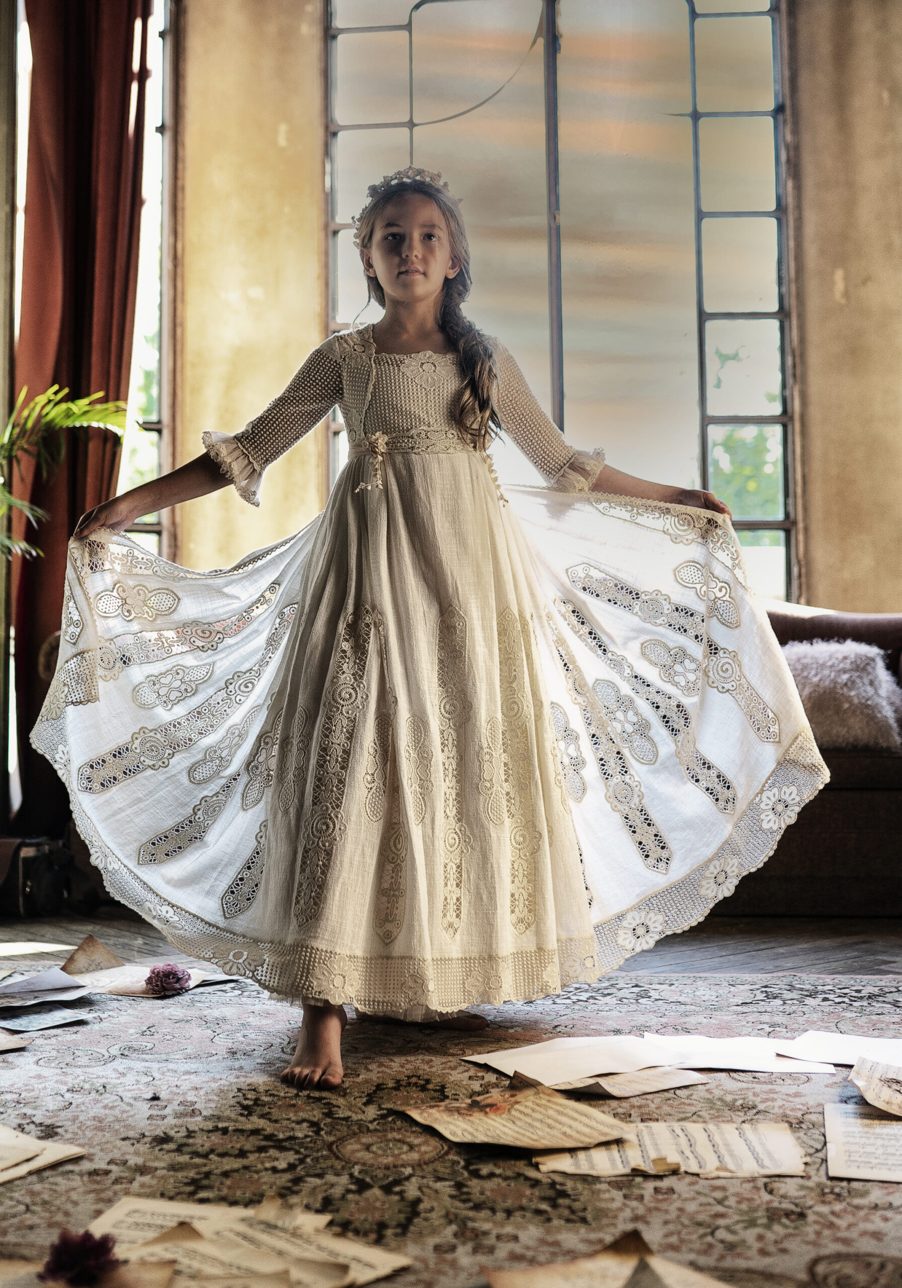 Vestido de Comunión Tul Beige con Espalda Guipur y tela Bordada.