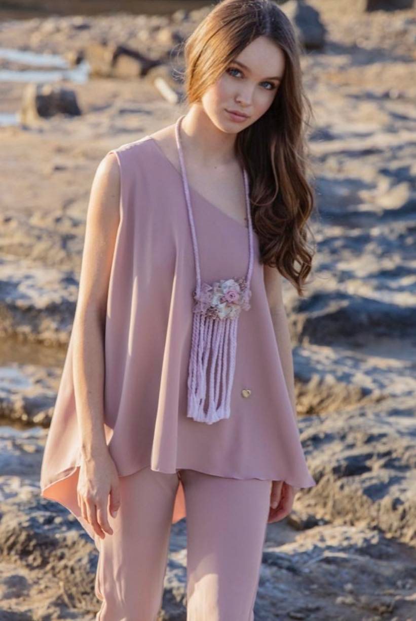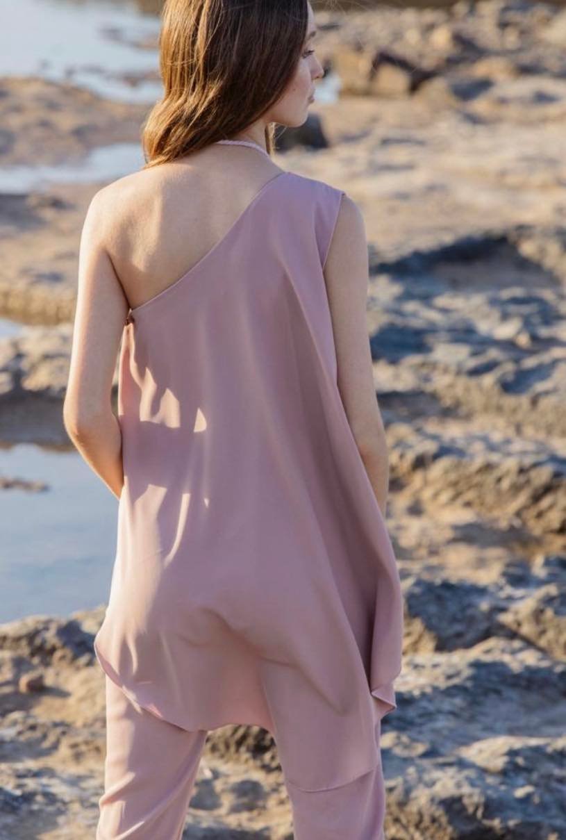 Elegante mono en color rosa empolvado con corte asimétrico simulando dos piezas.