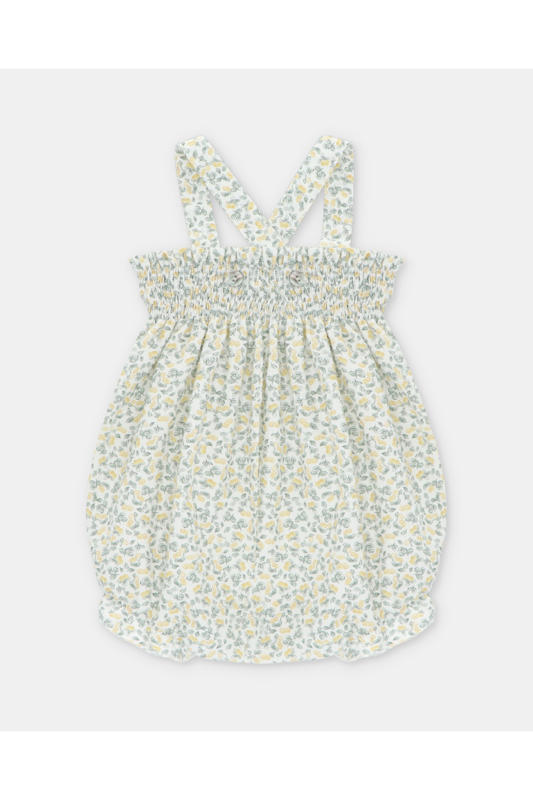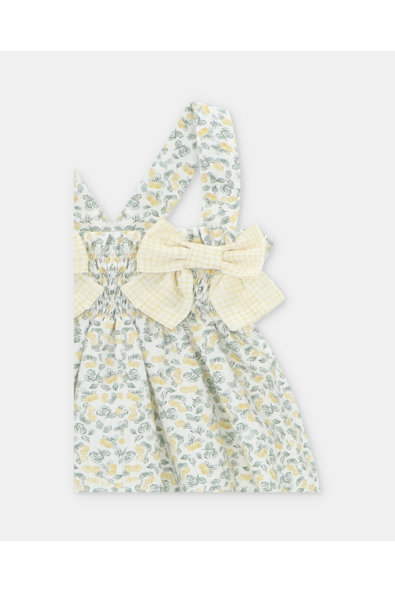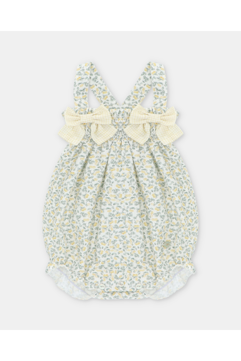 Ranita de bebé niña de tela microestampado de fantasía con tirantes cruzados y lazadas de vichy amarillo.