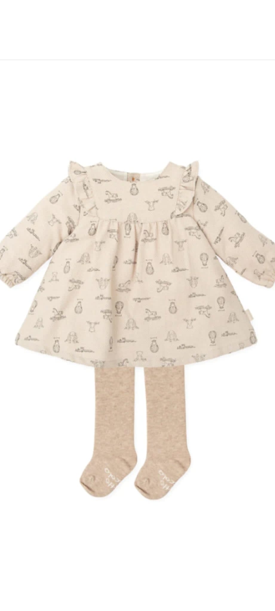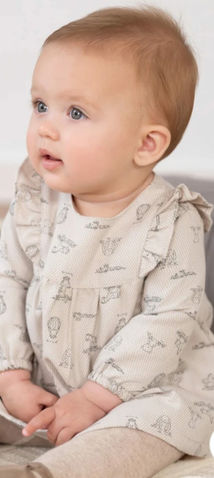 Vestido de tejido especial color arena con globos y animalitos estampados y suave forro.