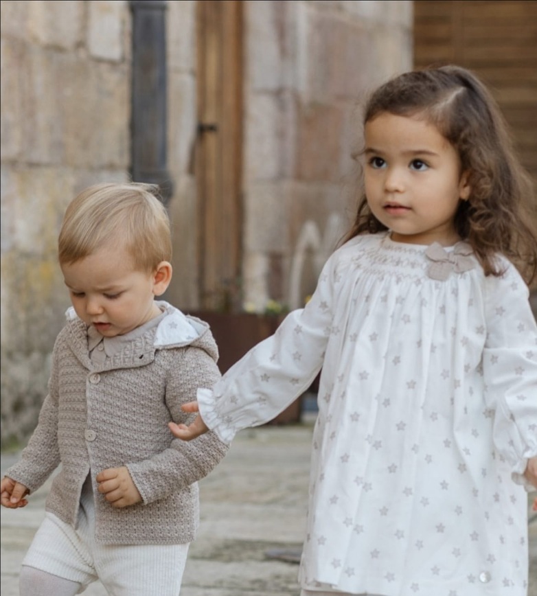 Vestido de manga larga para niña confeccionado en tejido estampado con encantadoras estrellas bordadas. Destaca por los detalles de nido de abeja en el pecho y las mangas. Presenta un cuello redondo clásico y un detalle adicional de lazada en gasa del mismo tono. Se cierra en la parte trasera con botones a juego, completando un look encantador y cómodo para tu pequeña. Braga en tejido con estrellas bordadas. Detalle de pespunte en pierna, logrando un ligero volante. Elásticos en pierna y cintura para mayor confort y ajuste. Ideal para coordinar con los vestidos de la colección.