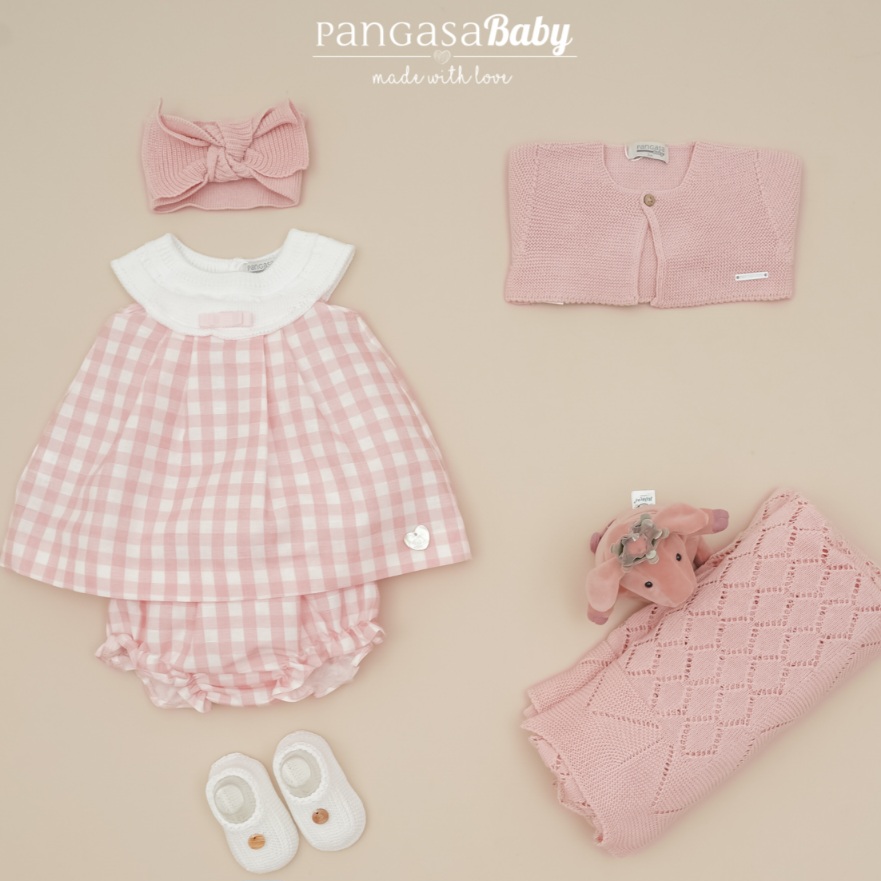 Vestido de cuerpo hilo en color blanco y estampado de cuadros en rosa empolvado.