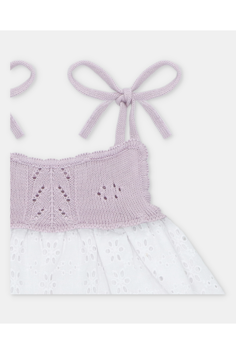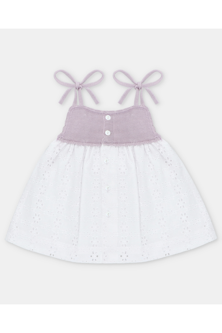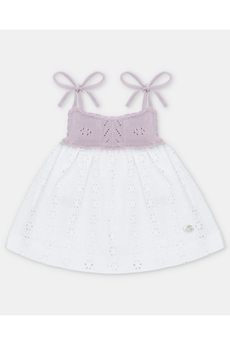 Vestido de bebé niña de punto combinado con tela bordada calada, detallado por punto calado y placa ovalada.